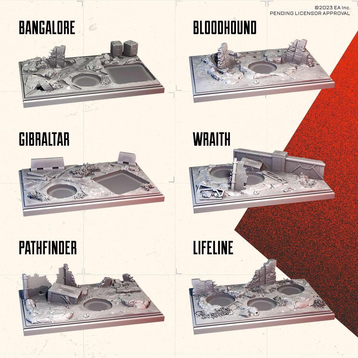 Take your Legends to the next level! This expansion introduces a set of plastic card holder dioramas for all 6 Squad 1 Expansion Legends from Apex Legends™: The Board Game: Caustic, Crypto, Mirage, Octane, Revenant, and Wattson.