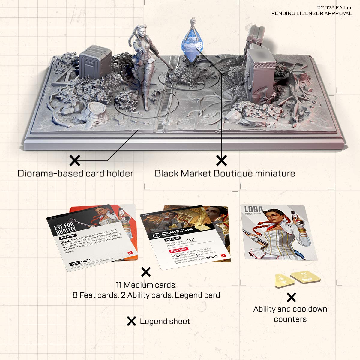 This expansion offers a wealth of new content for Apex Legends™: The Board Game, most importantly adding the notorious loot scout Loba into the game’s Legend roster. Loba uses her Burglar’s Best Friend bracelet to escape from perilous situations and makes sure her squad has access to the best equipment available by deploying her Black Market Boutique directly onto the battlefield.
